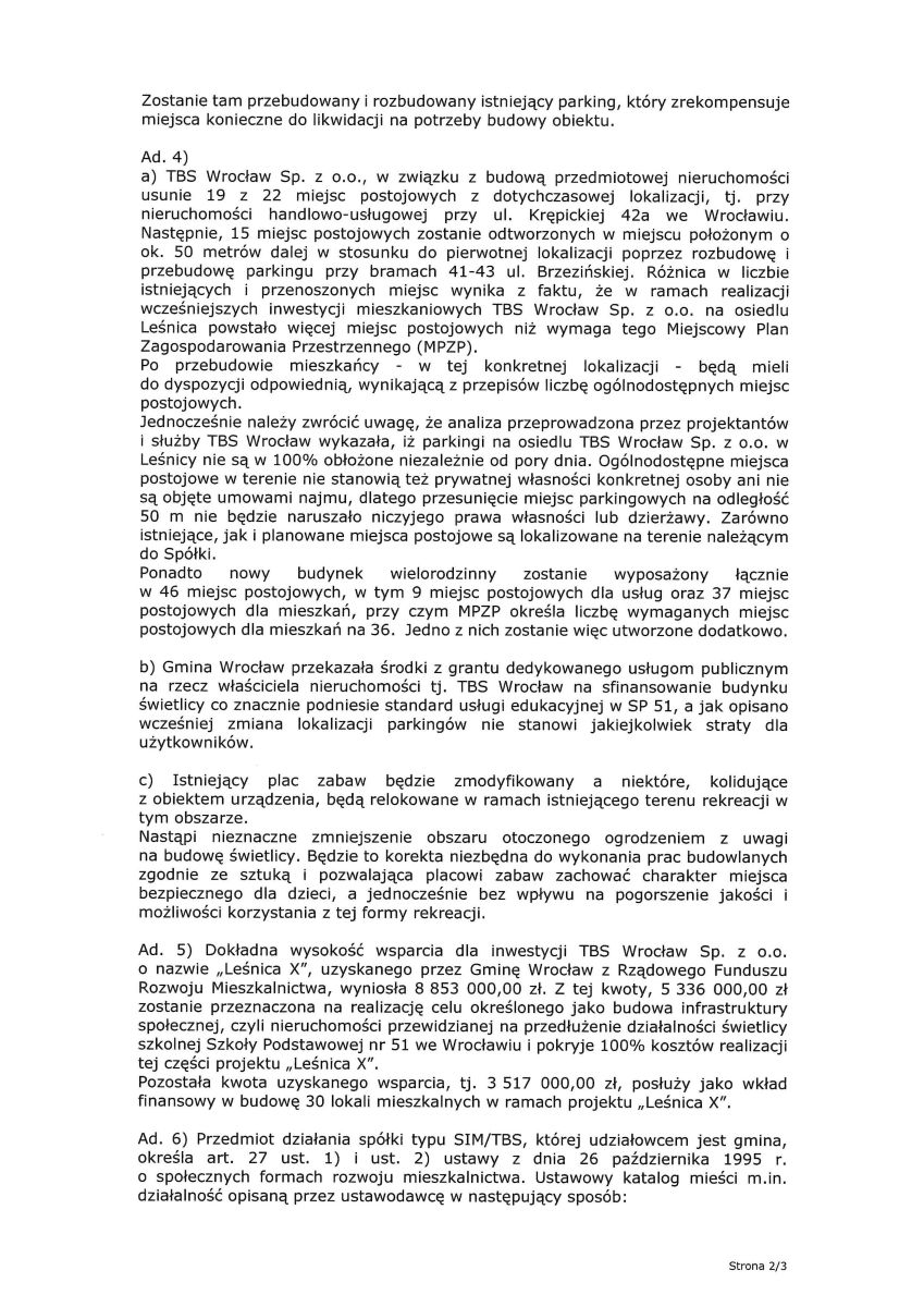 3. TBS twierdzi, że świetlica (teraz już środowiskowa, ale na cele SP 51) jako infrastruktura społeczna jest zasadniczą częścią umowy o grant zawartej z gminą Wrocław.