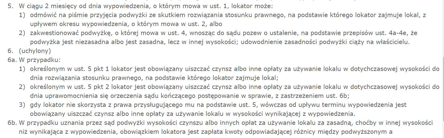 W tych paragrafach są zapisy nie tylko o sposobie ustalenia wysokości czynszu, ale przede wszystkim o prawie do wystąpienia przez lokatorów o uzasadnienie podwyżki oraz prawie do złożenia sprawy do sądu w ciągu 2 miesięcy od wypowiedzenia starej stawki czynszu. W czasie sprawy sądowej czynsz pozostaje na poprzednim niepodwyższonym poziomie aż do prawomocnego orzeczenia sądu w tej sprawie. W przypadku przegranej lokator uiszcza właściwą podwyższoną kwotę zaległości.