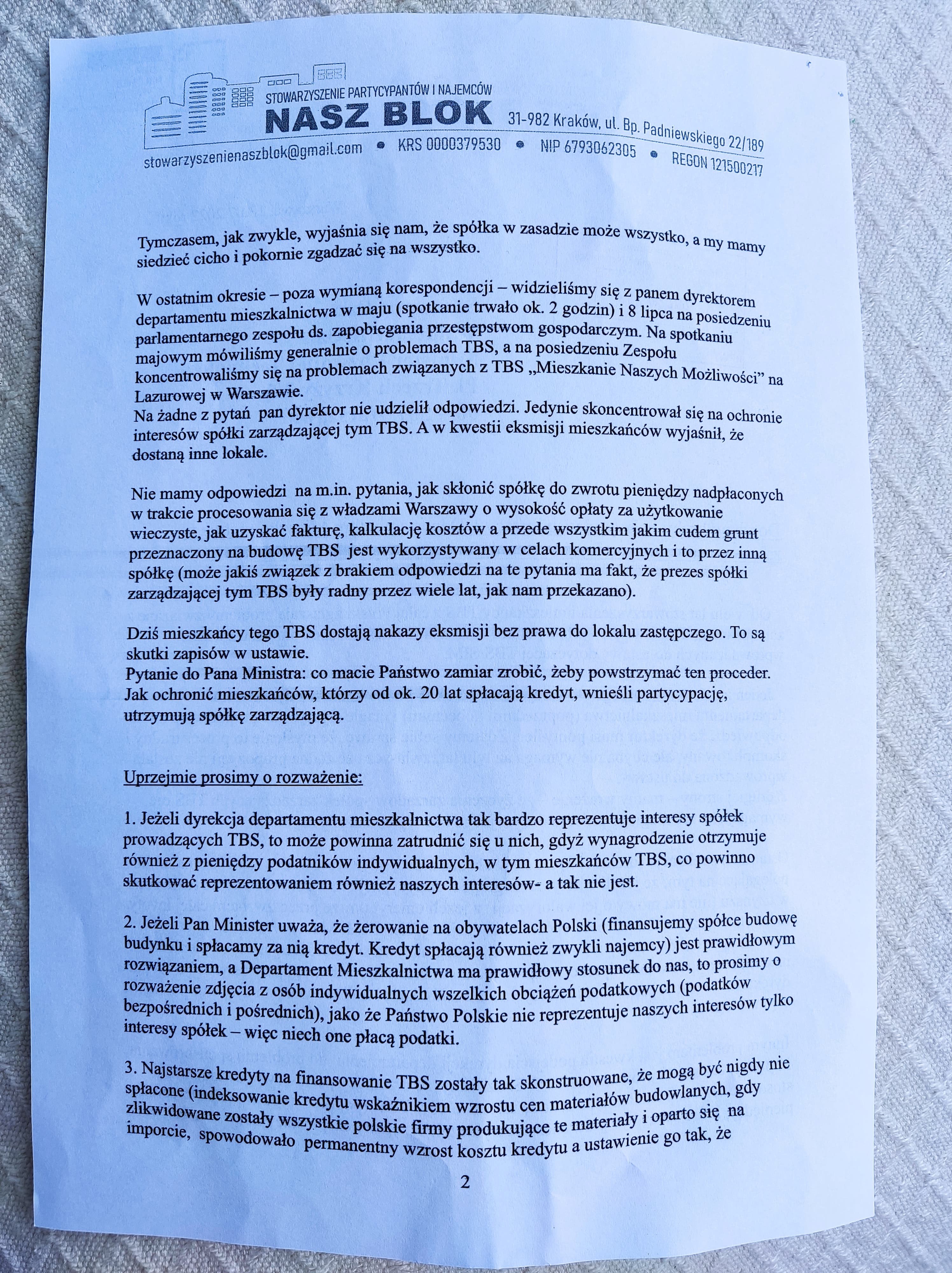 "Zdecydowaliśmy się na skargę, ponieważ Departament Mieszkalnictwa od lat wprowadza zmiany korzystne dla spółek TBS przy absolutnym braku zmian odczuwalnie korzystnych dla nas mieszkańców, jedynej strony pokrywającej koszty tego systemu. Departament Mieszkalnictwa od lat karmi nas obietnicami, za którymi nie idą żadne zmiany” - mówi Adam Mildner, wiceprezes Stowarzyszenia Partycypantów i Najemców NASZ BLOK.