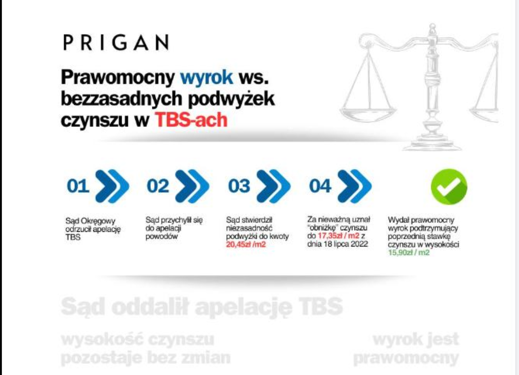 Informacja o 3 pierwszych wyrokach prawomocnych z Wrocławia wygranych przez mieszkańców. Czekamy na pisemne uzasadnienie. Z ustnego wynika, że Sąd w całości podzielił argumentację mieszkańców. Spółka TBS Wrocław mimo tego nie wycofuje się z kontynuacji kolejnych spraw, ignorując wezwanie mec. Prigana do zawarcia ugody. To niestety naraża mieszkańców na ponoszenie kolejnych kosztów (opłacamy również pełnomocników prawnych spółki).